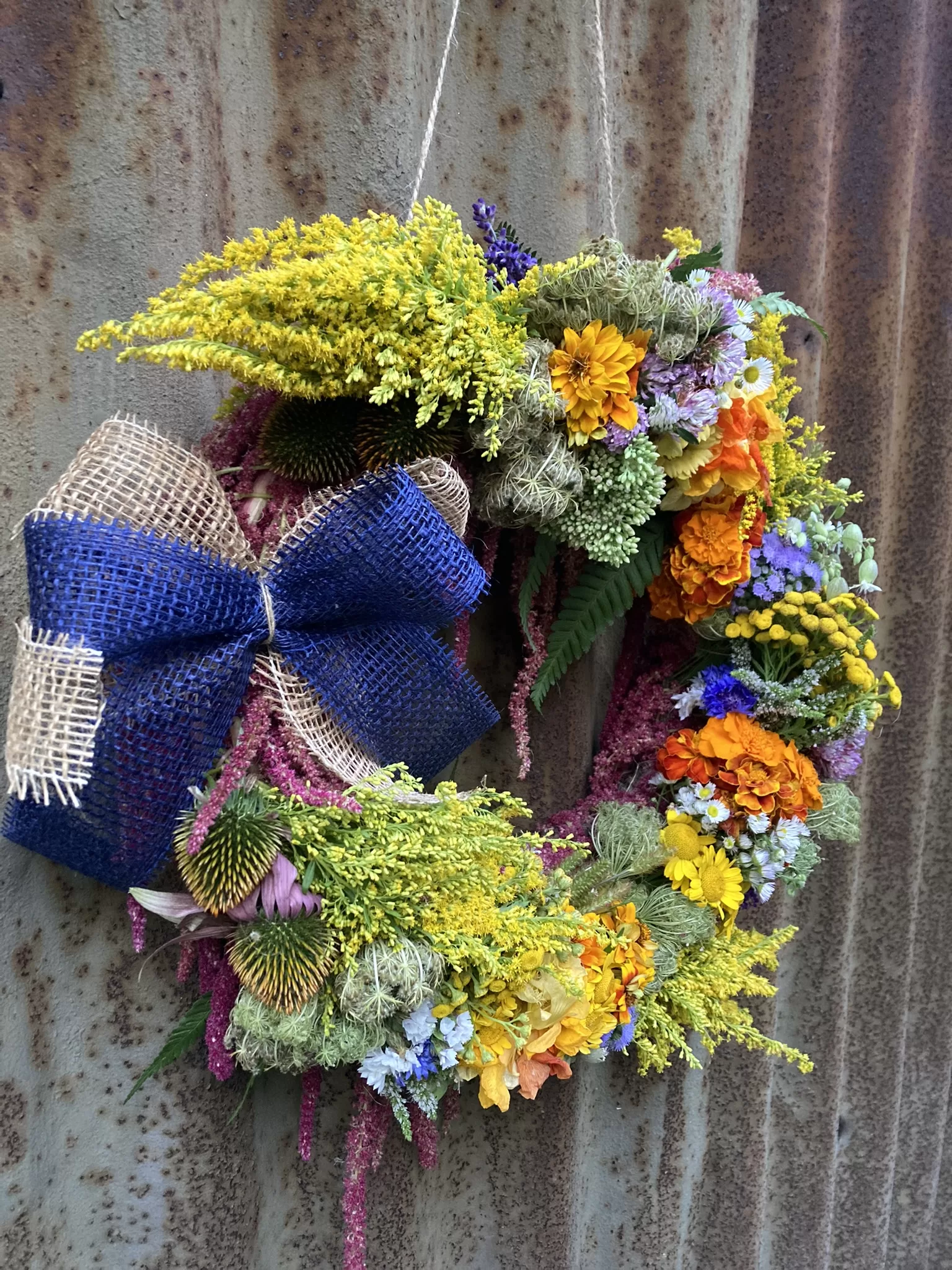 Ručně vázaný věnec z čerstvých květin, plný vůně a sezónních barev. Ideální jako dekorace na dveře, stůl či stěnu. Každý věnec je originál, složený z lokálních květin pěstovaných s respektem k přírodě.